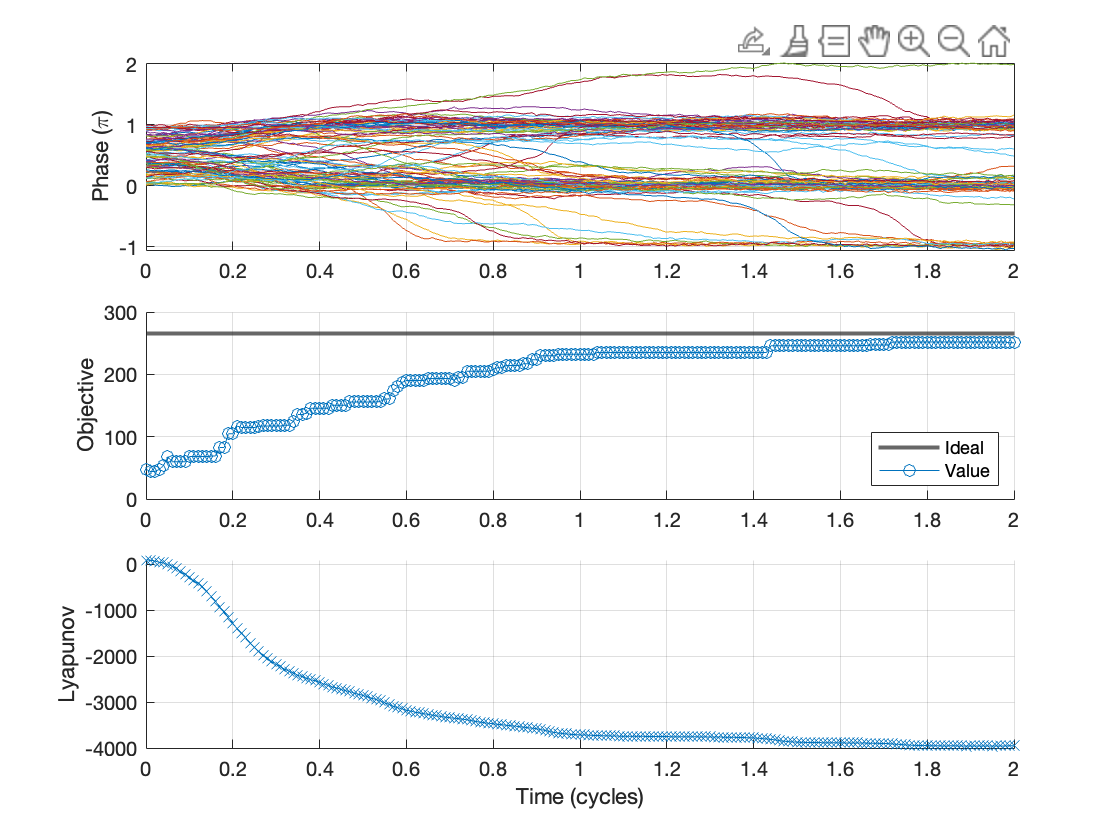 The simulation below shows a larger example of 100 oscillators using a ramped annealing strength. Here, it almost reaches the optimal configuration but in general varies per problem.